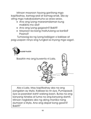 Magbigay ng mga tamang impormasyon subalit siguraduhing ito ay akma sa kanilang kaisipan at edad. 313 Kaya hindi na ito ang panahon para bumalik sa dati nating pag-iisip paggawi pamantayan at mga ambisyon. Sa tuwing sisigaw ang aking guro Walang tularan ang mahuli koy ipapatawag ko ang mga magulang nyo Titingin ako sa aking papel Kahit blanko ang isipan ko.
