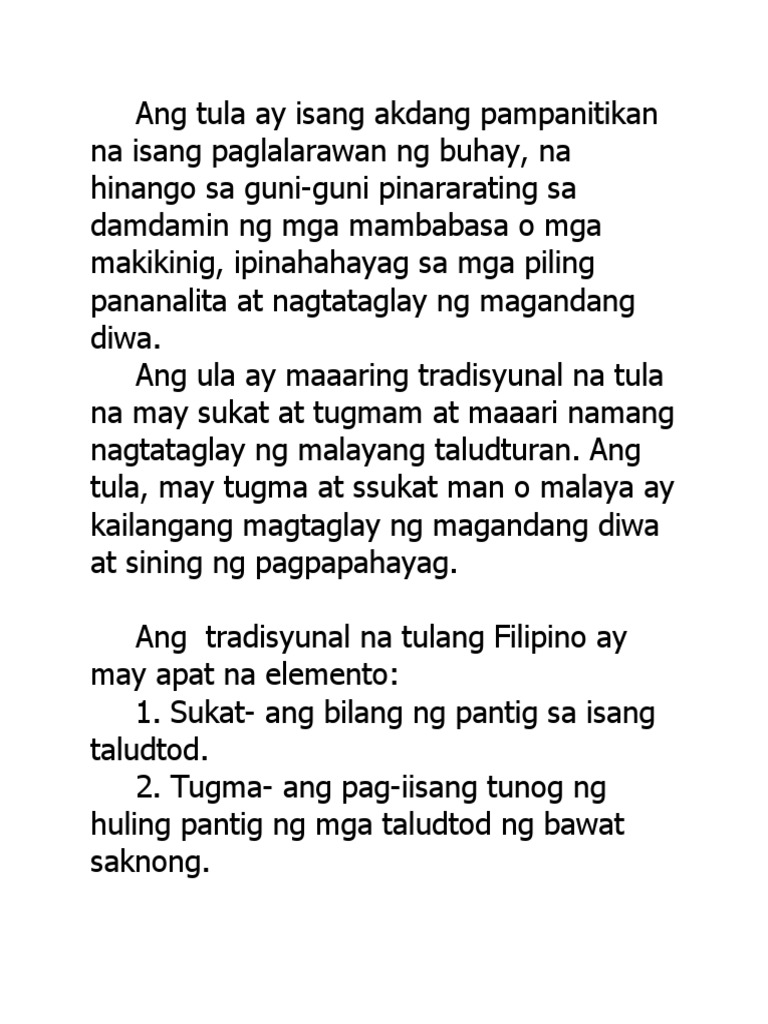 View Ang tuladoc from BS FILIPIN 103 at Bukidnon State University Main Campus Malaybalay City Bukidnon. Tradisyonal may sukat tugma at mga matalinhagang. Ito ay may apat 4 na anyo.