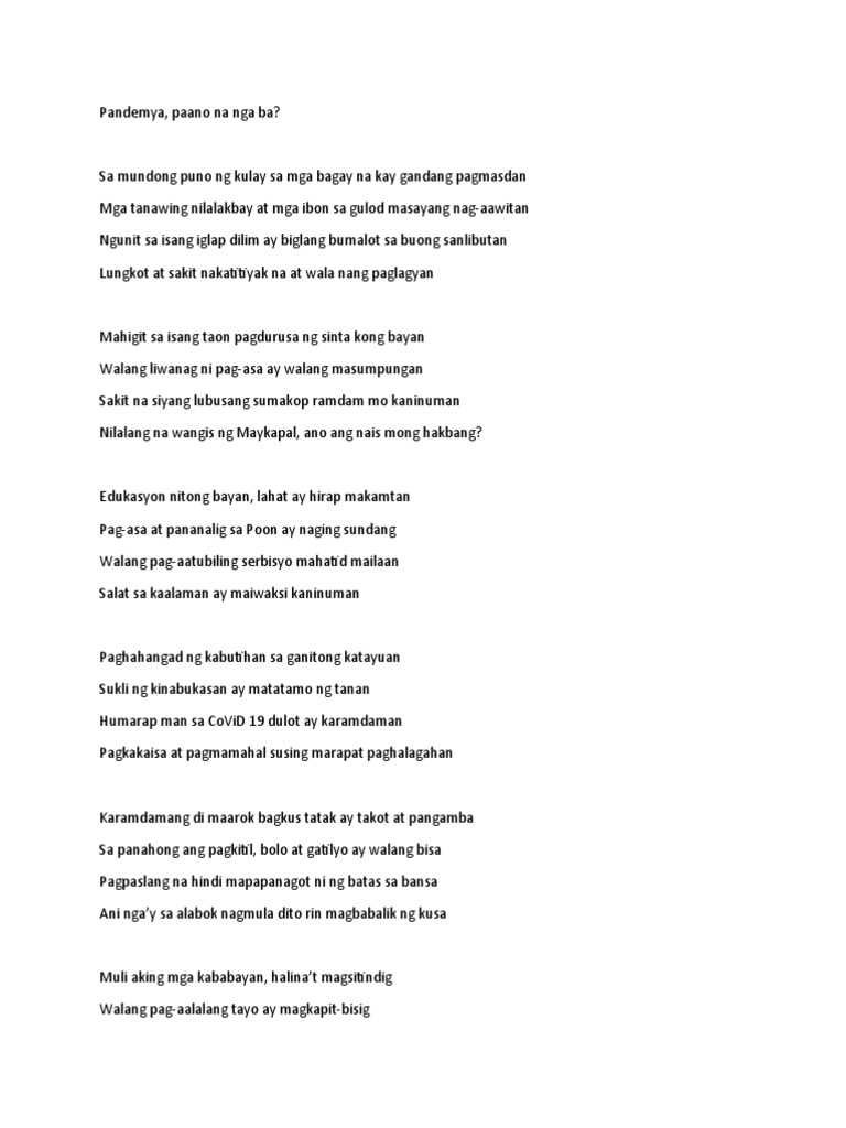 Ang ating mga bayaniy ibinuwis ang kanilang buhay. Ang Wikang Filipino ay para sa lahat Ilocano man o Cebuano Batangenio o Bicolano lahat tayo ay Pilipino Edgar Gian Bernardino Balitang agham tungkol sa pagbabago ng klima. Tula Tgumawa Ng Tula Tungkol Sa Pandemya 12 Sukat 4 Na Taludtod2 Saknongmay Brainly Ph.