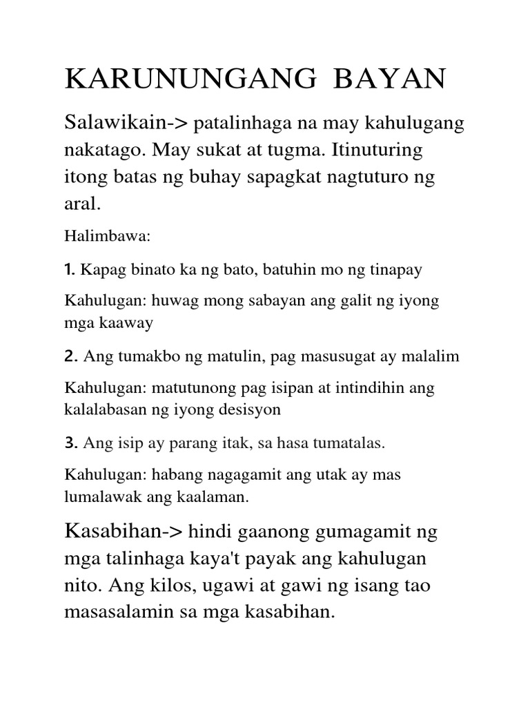 KARUNunGANG BAYAN SALAWIKAIN SAWIKAIN BUGTONG PALAISIPAN BULONG KASABIHAN KAWIKAAN A. Mayaman ang mga Pilipino sa karunungang bayan tulad ng salawikain sawikain bugtong palaisipan kasabihan at mga kawikaan. Ang pantig naman nito ay maaaring apat hanggang labindalawa.