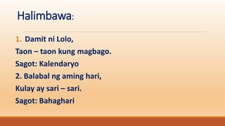 Nabibigkas nang may wastong ritmo ang ilang halimbawa ng tulaawiting panudyo tugmang de gulong at palaisipan. Tugmang de- Gulong 12. Aanhin pa ang gasolina kung jeep ko ay sira na.