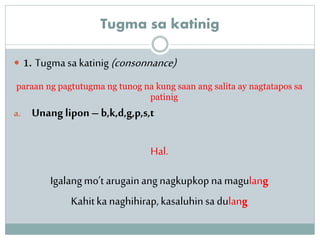Ang tugmâng patínig at tugmâng katínig. KKPKK katinig katinig patinig katinig katinig Halimbawa. Makikilala ang tunog sa pamamagitan ng pagbigkas ng dulong patinig o ng dulong katinig ng mga salita.